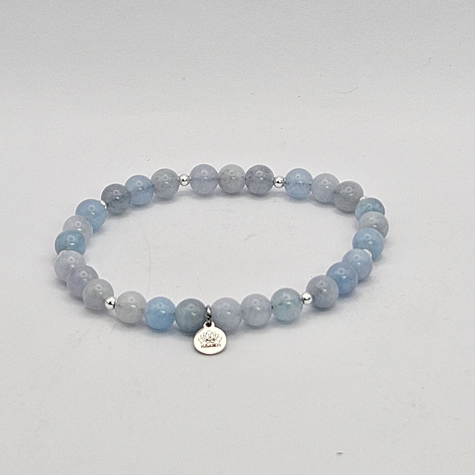 Piedras y Significado: Está elaborada con cuentas redondas de Aguamarina natural de 8 mm. La Aguamarina es la "piedra del marinero", históricamente usada como talismán de protección en viajes y considerada una piedra de coraje. Su energía calmante es excepcional para reducir el estrés y la ansiedad. A nivel espiritual, estimula el chakra de la garganta, promoviendo la comunicación clara, la verdad y la autoexpresión sin miedo. El toque de PLATA (cuentas de 3 mm) amplifica la pureza y la potencia energética del cristal.