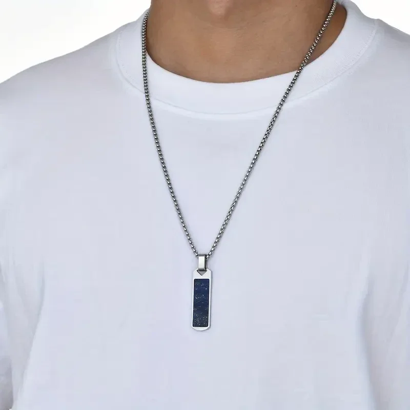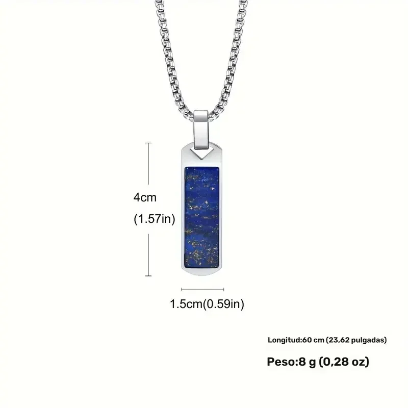 Este collar es una poderosa declaración de estilo y conciencia. Presenta una placa rectangular de Lapisalázuli auténtico, incrustada en una estructura de Acero Inoxidable de alta calidad. La gema, con su profundo color azul salpicado de pirita dorada, evoca un cielo nocturno estrellado.