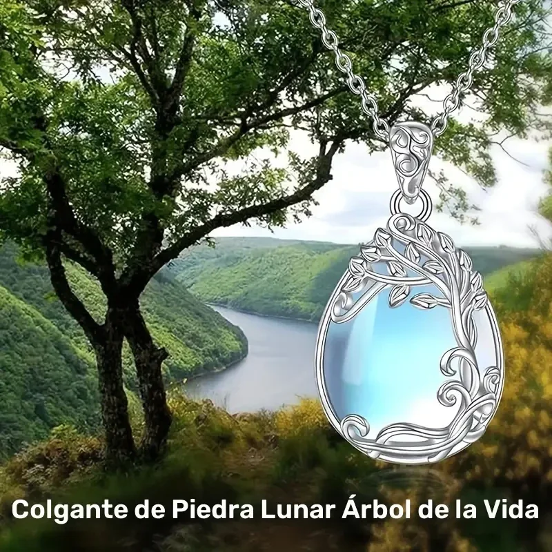 Este elegante colgante de inspiración celta o naturalista presenta una lágrima de Piedra Lunar (Opalina/Cuarzo Aura) con un brillo iridiscente que evoca la luz de la luna llena. La gema está enmarcada por un intrincado diseño de hojas y enredaderas, simbolizando la vida y el crecimiento.