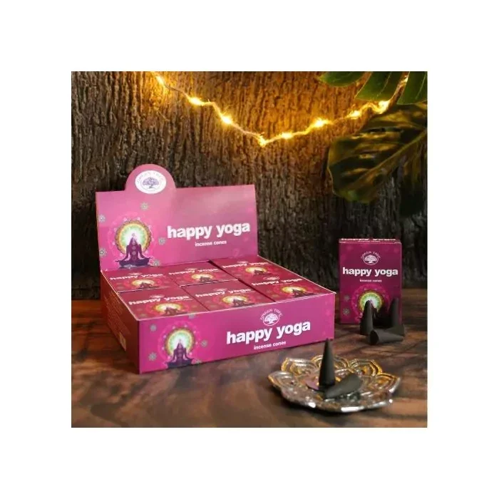 Este incienso en cono de la marca "Green Tree" con la fragancia "Happy Yoga" está especialmente formulado para crear una atmósfera de calma, enfoque y bienestar.