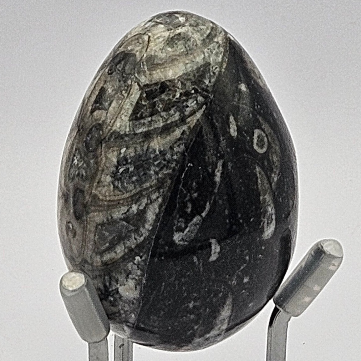 Esta es una impresionante pieza de ORTHOCERAS PULIDO, un tipo de cefalópodo marino extinto que vivió hace cientos de millones de años. La pieza ha sido tallada y pulida en una forma suave de huevo (6 x 5 cm), lo que resalta maravillosamente las cámaras internas del fósil. Los patrones distintivos de las vetas claras (las cámaras) sobre el fondo oscuro (negro o marrón) atestiguan la increíble perfección de la naturaleza geológica.