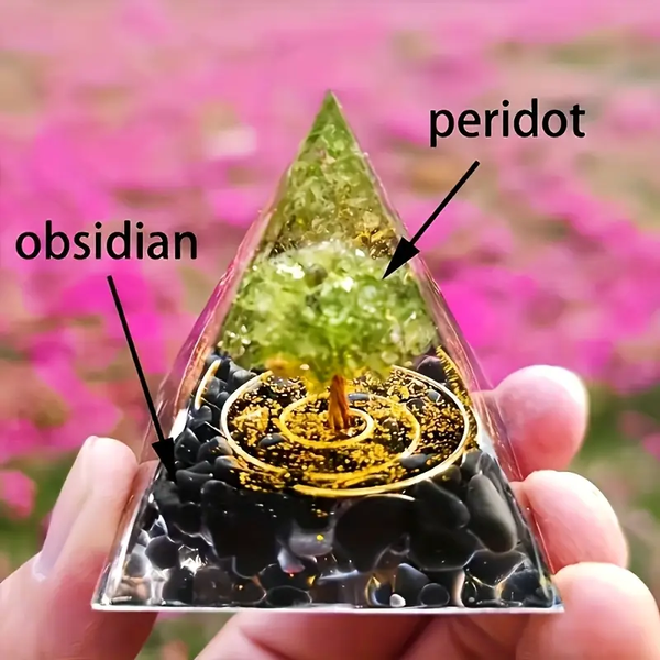 PIRÁMIDE ORGONITA CON ÁRBOL DE LA VIDA, OBSIDIANA Y PERIDOTO